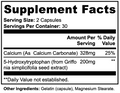 Ingredients: Calcium (as Calcium Carbonate), 5-Hydroxytryptophan (from Griffo via simplicifolia seed extract), Gelatin (capsule), Magnesium Stearate.